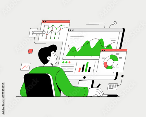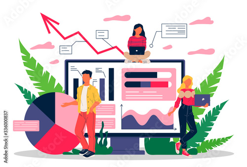 Happy adult male characters using laptop, tablet for reading digital books, news, sending email, vector flat illustration. Increased role of digital devices in everyday life of adult people concept.