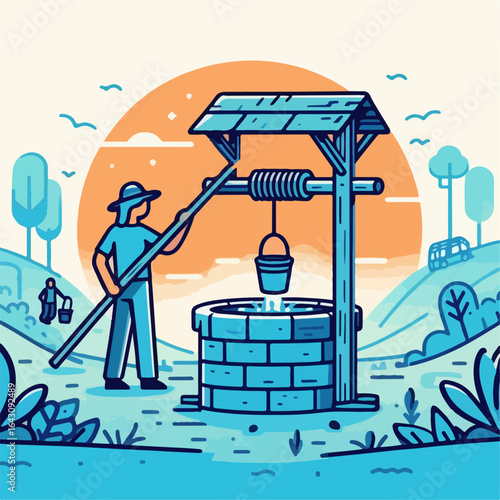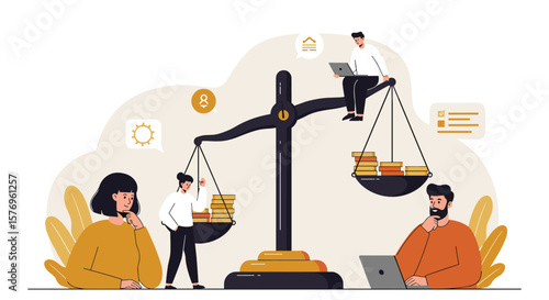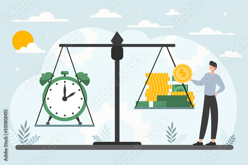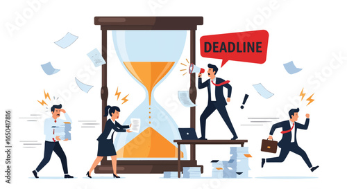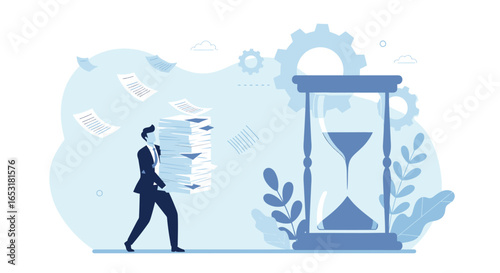 Young couple with newborn baby, huge hourglass, middle aged and old male characters, flat vector illustration. Aging process, lifespan, generation, human life cycle from infancy to senior years.