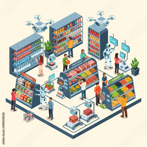 Ai control farm vector illustration. Smart greenhouse under robot machines operation. Futuristic humanoid farmer cultivating greenery and vegetables. Agritech automated system