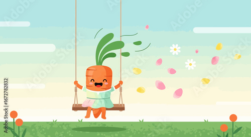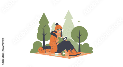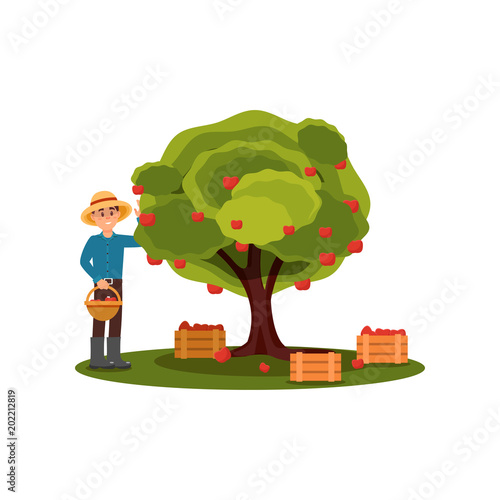 AI robot agronomist harvesting in garden picking ripe fruit from tree vector illustration. Automated farm life, horticulture and crop cultivation concept
