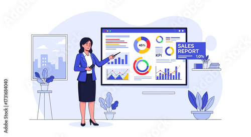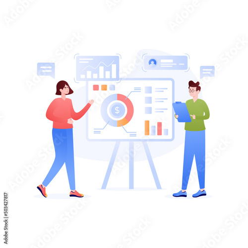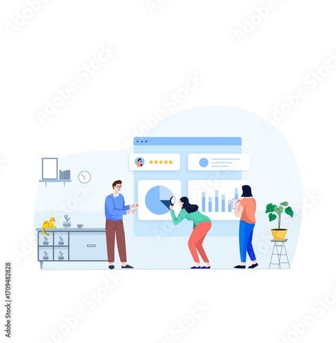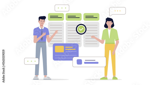 AI working better than human, flat vector illustration. Robot machine and business woman working on computers and marking checklist. AI vs human productivity. Robots superiority.