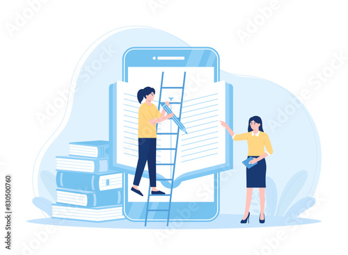 AI working better than human, flat vector illustration. Robot machine and business woman working on computers and marking checklist. AI vs human productivity. Robots superiority.