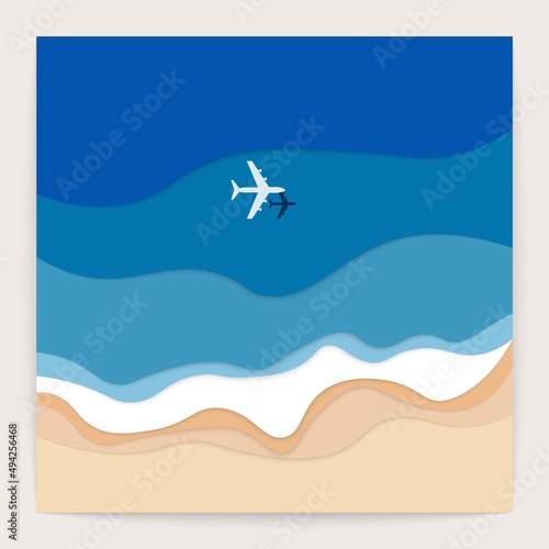 Air travel, vector aerial view layered paper cut style illustration. Plane flying to Paris over city buildings. Worldwide travel, discover new world concept.