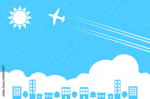 Air travel and tourism vector with plane flying over cityscape, business skyscrapers high-rise buildings paper cut craft illustration. Transport and transportation, vacation and adventure concept