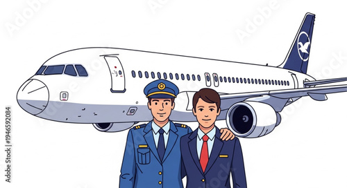 Airline cabin crew, pilot and stewardess cartoon characters wearing face masks standing in front of plane, flat vector illustration. New antiviral flight rules, new normal of air travel, safe flight.