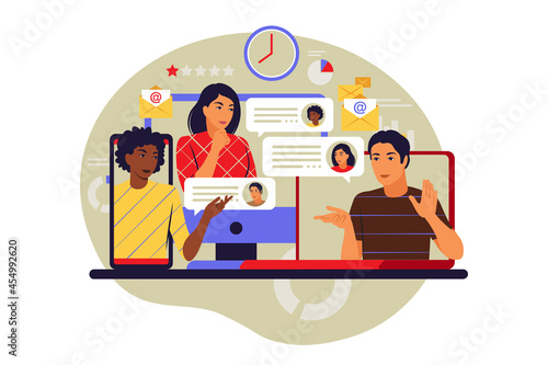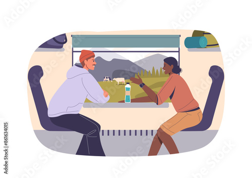 Airplane cabin interior with people aboard. Vector illustration. Passengers reading and watching plane window during a flight. People travel by plane in economy class.