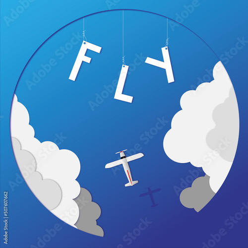 Airplane flying in the sky, vector illustration in paper art modern craft style. Travel by air concept for poster banner, website page etc.