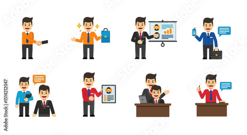 Airport people vector icon set with pilot, stewardess, ticket counter, ramp agent and passengers making online ticket reservation, passing security checkpoint at airport terminal. Flat style design.