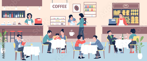 Airport terminal, waiting hall scene set, flat vector illustration. Passengers checking in, waiting for flight in departure lounge sitting on chairs, walking with luggage.