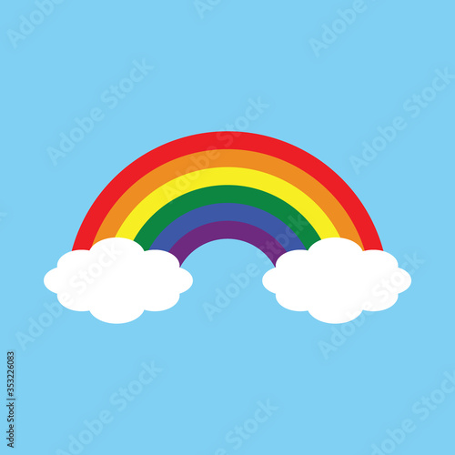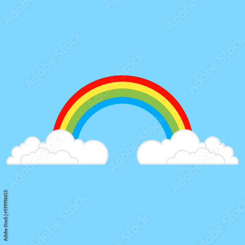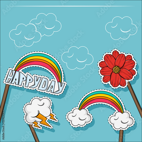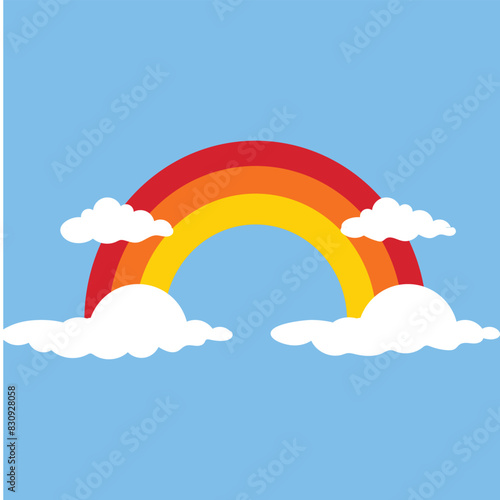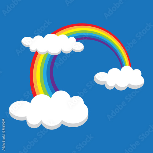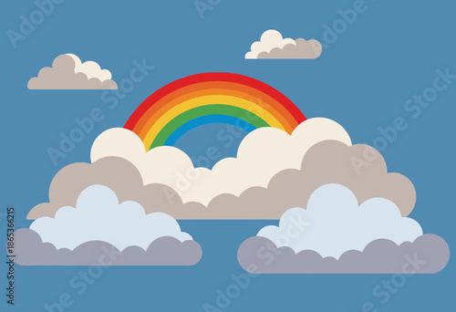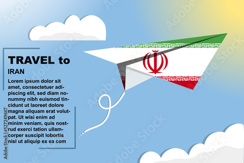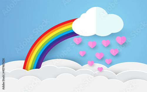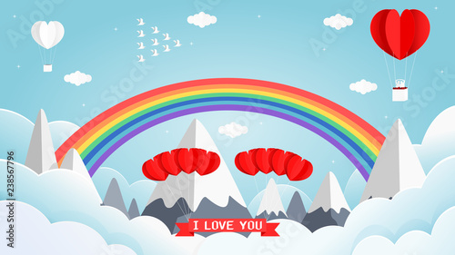 Airship with red ribbon rainbow and clouds in the sky. Vector illustration in paper art style. Travel poster banner design template.