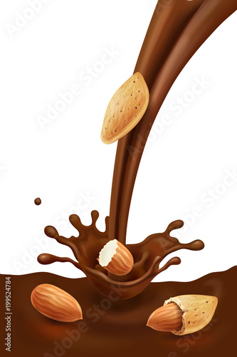 Falling almond seeds in chocolate flow realistic vector icon isolated on white background. 3d sweet dessert brand design element