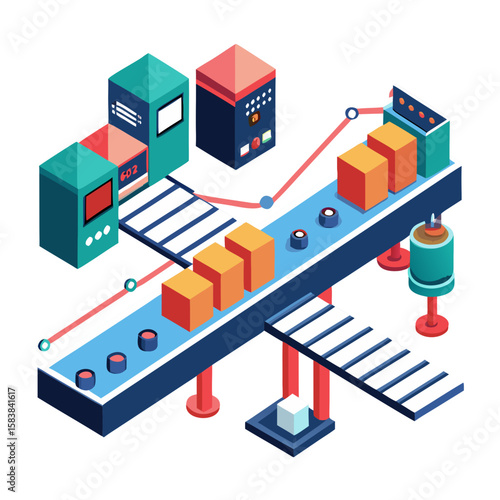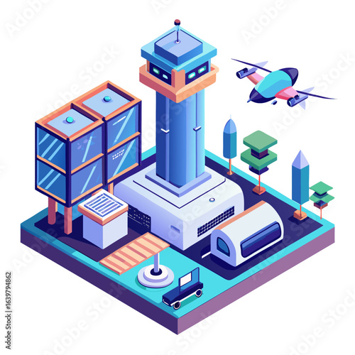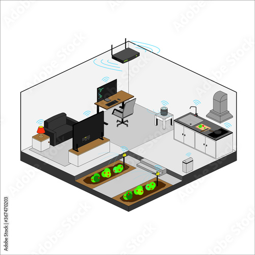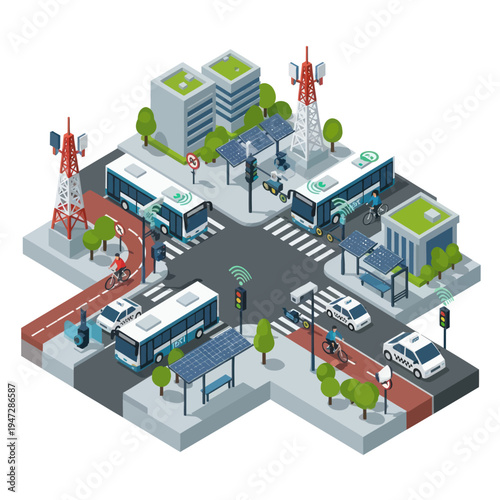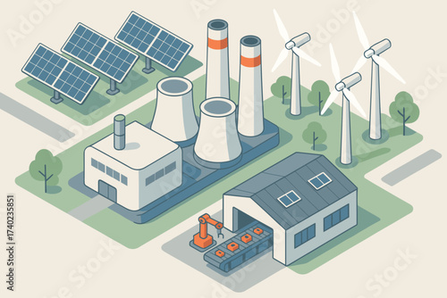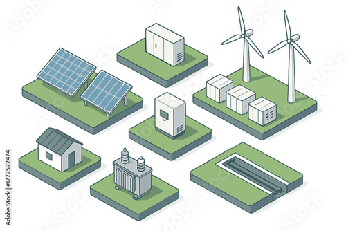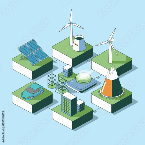 Alternative energy concept vector flat illustration. Isometric car, laptop, smartphone and city house connected to battery charging with energy produced by solar panels and wind turbines.