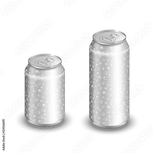 Aluminum cans with water drops realistic design. Blank wet metal silver tin for soda or beer cold drink isolated on white background. Vector mockup