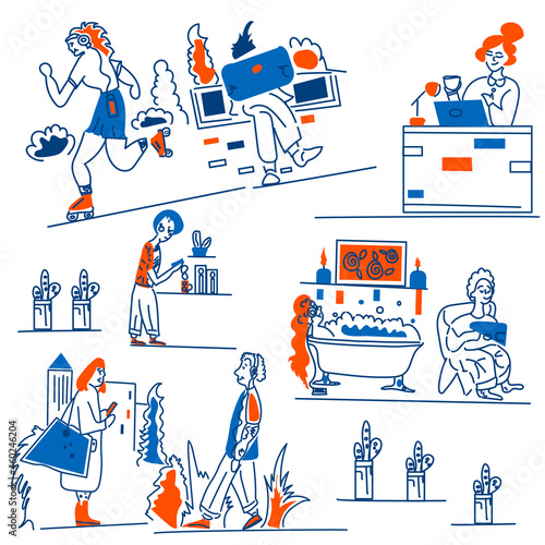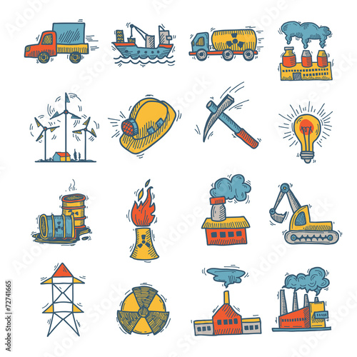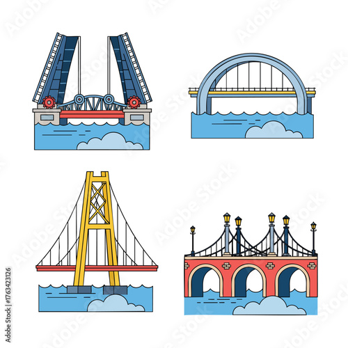 Amusement park vector flat icon set with circus tent, roller coaster, carousel, ferris wheel, bumper cars attractions, ice cream cart, ticket office and happy family with balloon and ice-cream.