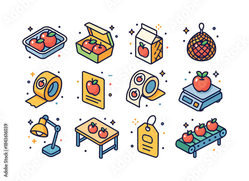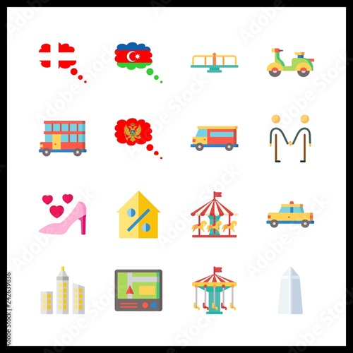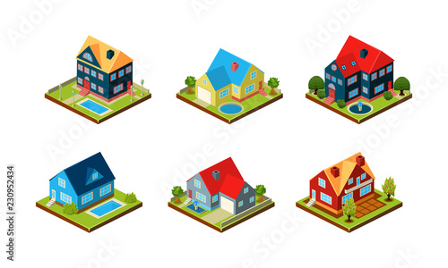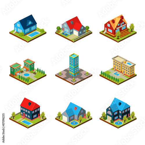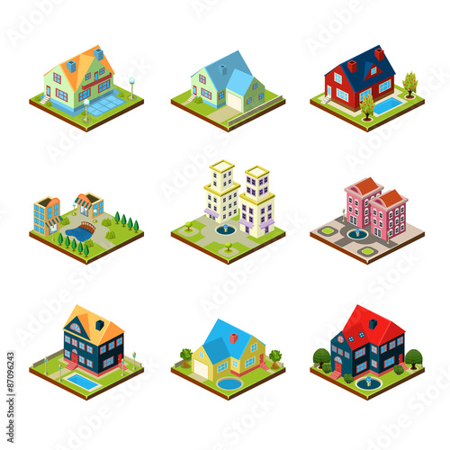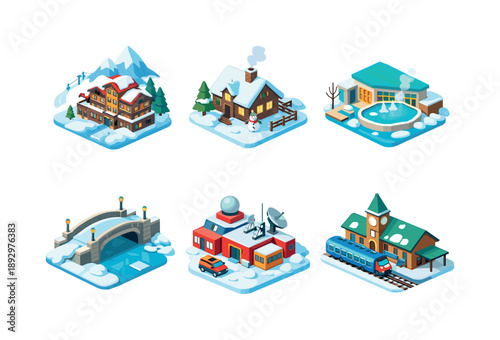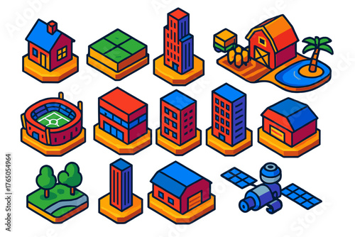 Amusement park vector flat isometric icon set with roller coaster carousel castle ferris wheel circus tent shooting range bumper cars train ride areas, cotton candy and hot dog carts, ticket office.