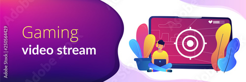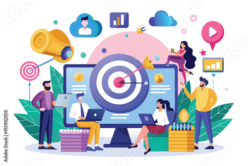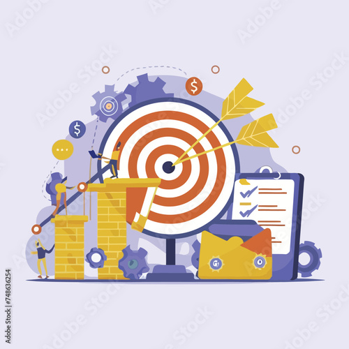 Vector illustration of tiny characters business analysts or auditors analysing statistical data to make strategic business decisions using big laptop computer with target on screen. Analytics concept.