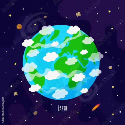 Ancient solar system with huge turtle, elephants holding planet Earth surrounded other space object vector illustration. Old vision, alternative theory of universe