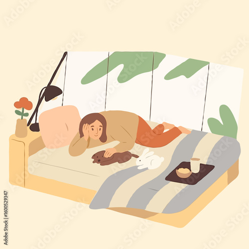 Angel keeper with wings and golden nimbus caring for sleeping boy child in home bed at night vector illustration. Support, protection and defense of children, faith and religion concept