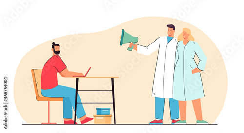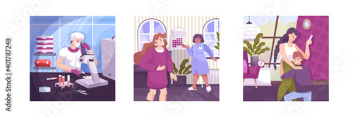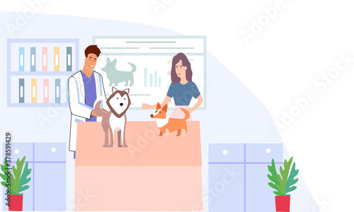 Animal shelter set, vector flat illustration. Happy couple visiting pet shelter with dogs and cats in cage. Girl adopting cute kitty, father with son donating money to save and support stray animals.