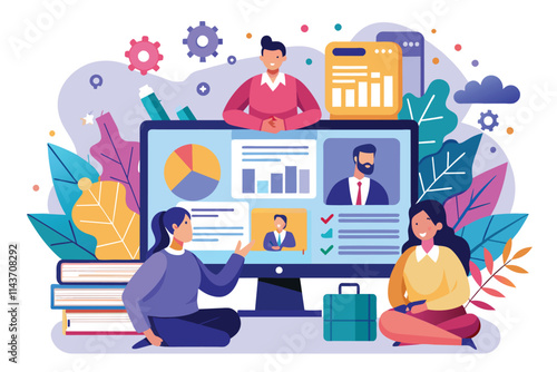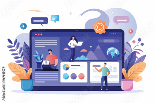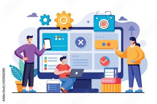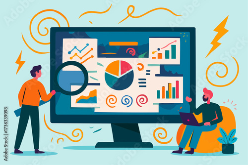 Vector illustration of tiny people catching bugs computer viruses in front of big desktop computer monitor with shield and padlock. Antivirus software, anti-malware concept for web banner, webpage.