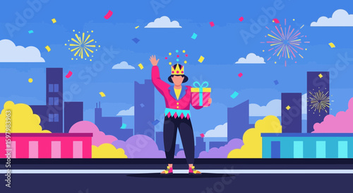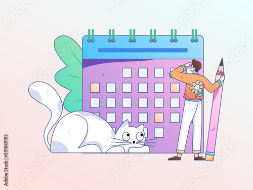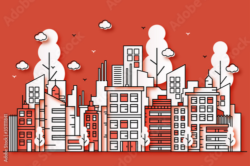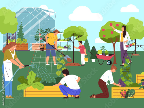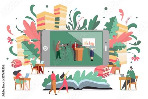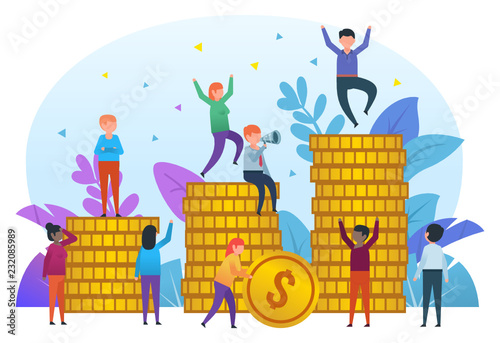Apartment building construction, flat vector illustration. Architect, builder worker, male and female characters with megaphones. Modern city building, construction development.