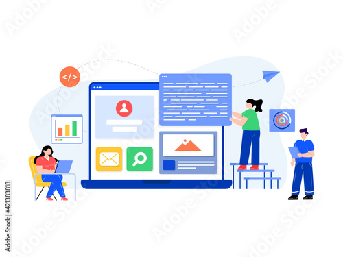 App development vector website template, web page and landing page design for website and mobile site development. Big smartphone and tiny people creating software application for mobile device.
