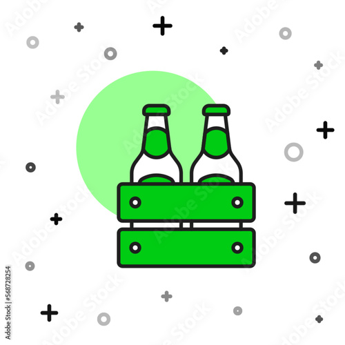 Apple cider package mockup. Vector realistic illustration of green glass bottle with label of alcohol drink fruit beer, ice cubes, bubbles. 3d apple cider poster, banner, flyer design template.