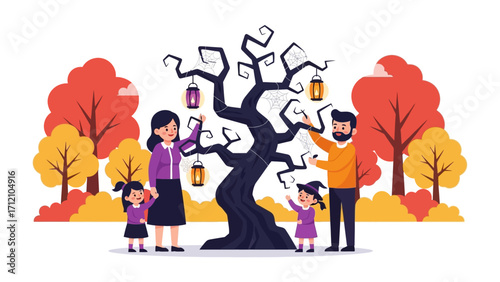 Male and female characters harvesting apples in garden using fruit picker, vector illustration. Apple picking concept for web banner, website page etc.