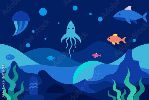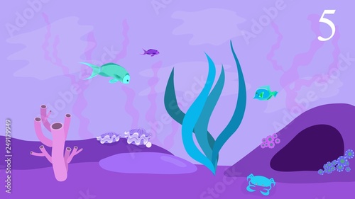 Vector layered paper cut style deep ocean bottom landscape with coral reef, fish, seaweed. Beautiful underwater world in public aquarium in paper art craft style. Underwater sea walk attractions.