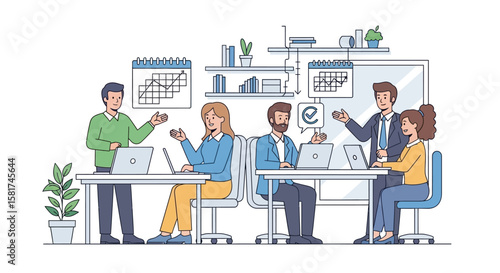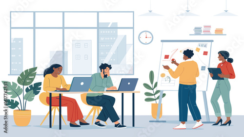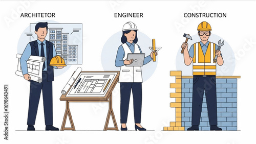 Professional architects, engineers working on architecture project of modern housing complex, flat vector illustration. Building industry, construction development.