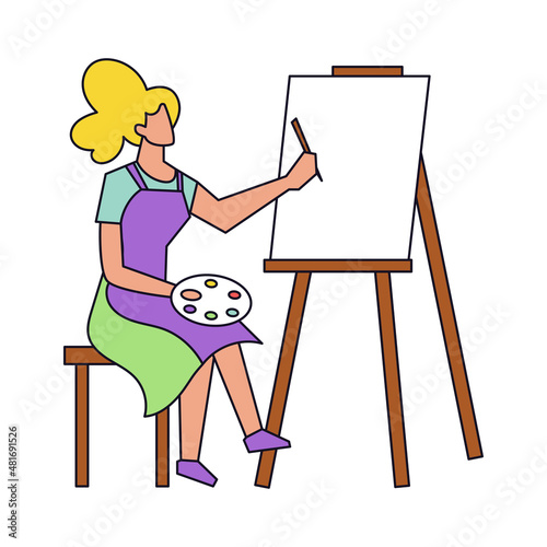 Woman in red beret artist drawing apple using easel. Vector flat illustration isolated on white background. Art creation, artistic and creative occupation concept for web banner, website page etc.