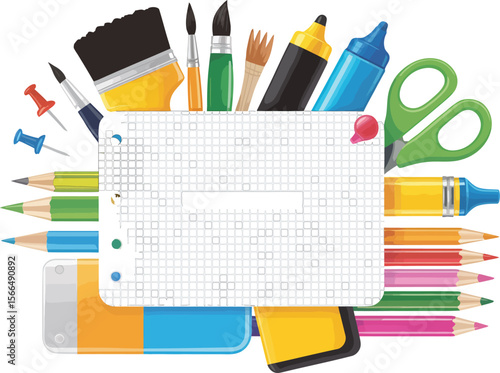 Art painter background, vector illustration. Art easel with canvas and copy space, artist tools and materials such as palette, painting brushes, paint tubes, pencils, knives, watercolor around it.