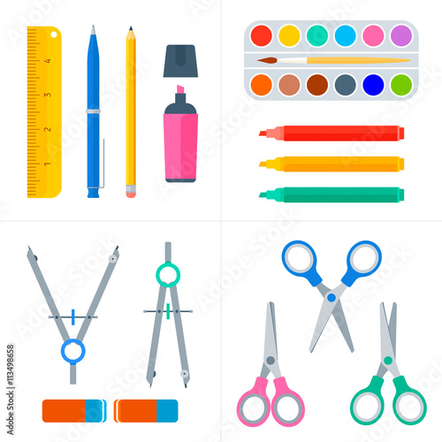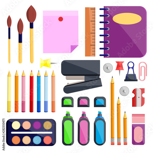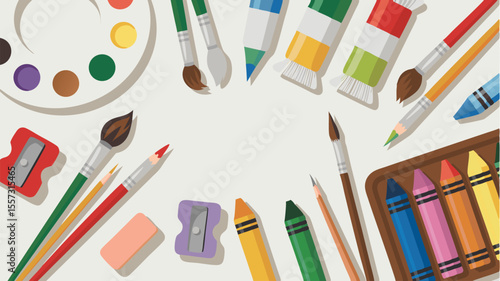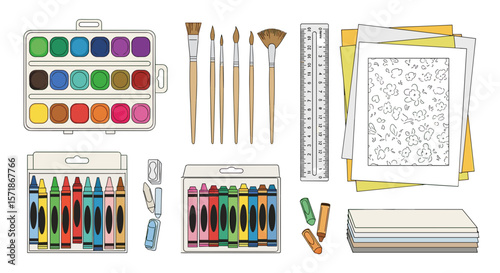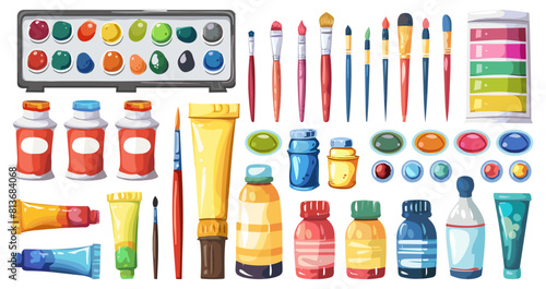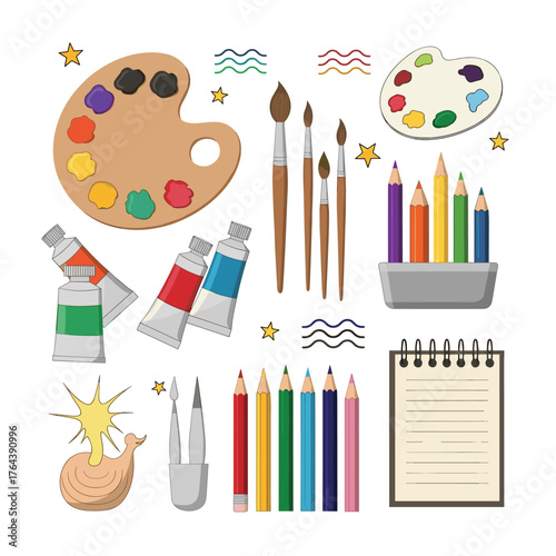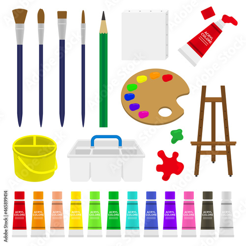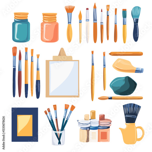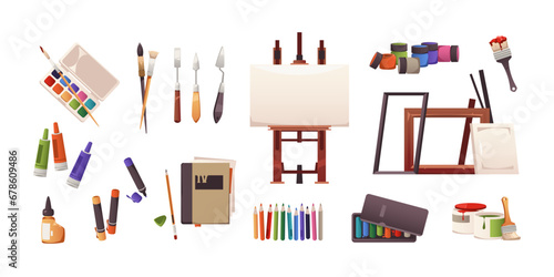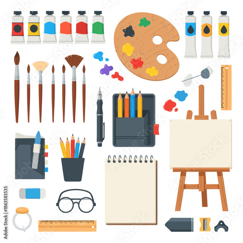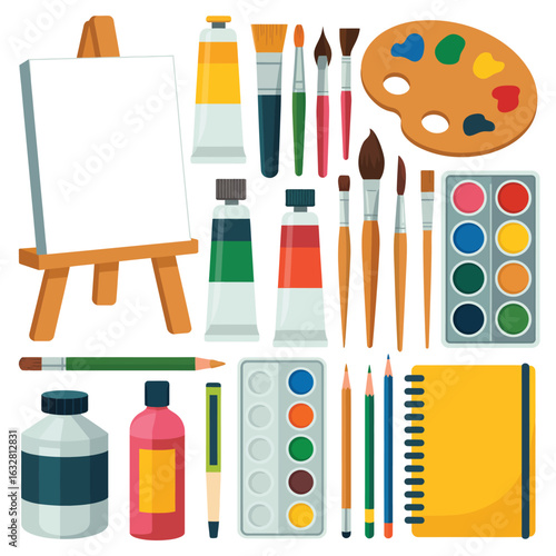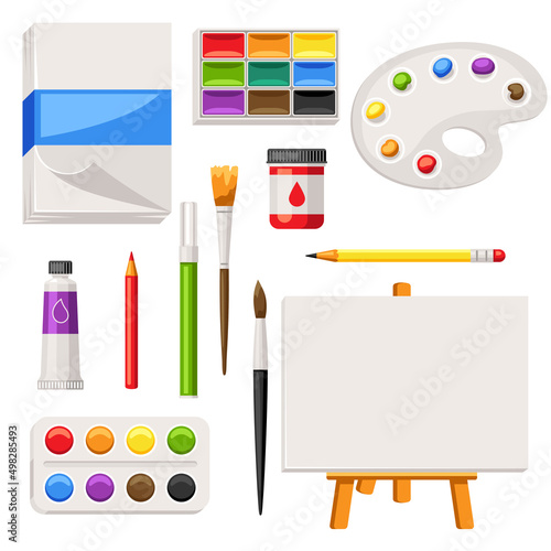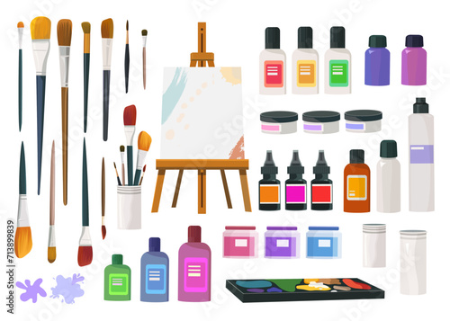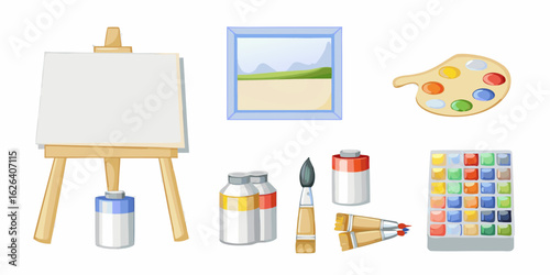Art painting tools and accessories, vector isolated illustration. Art equipment and supplies, artist tools and materials easel with canvas, palette, painting brushes, paint tubes, pencil, watercolor.