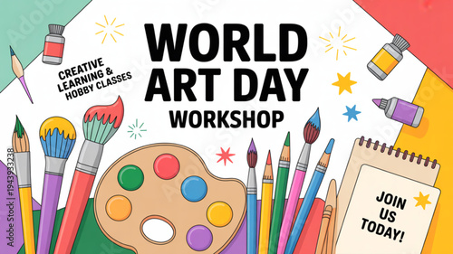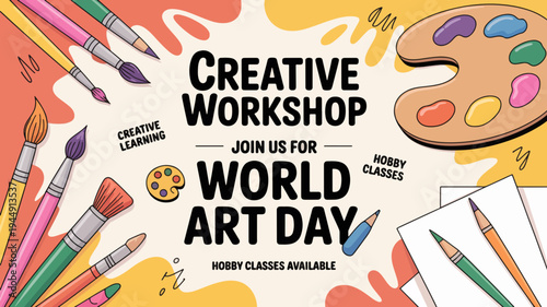Art studio label, emblem, logo vector template. Realistic artist palette with tools for painting such as paintbrushes, watercolor paints, knives and pencils.