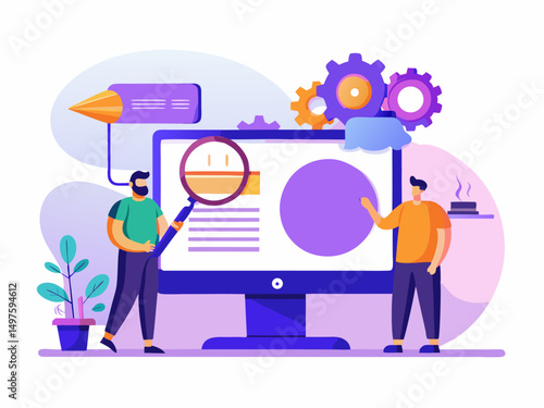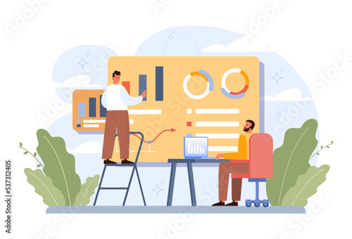 Road repair, maintenance and construction vector illustration. Male characters workers driving yellow asphalt compactor roller, working with shovel, holding traffic cone. Asphalt pavement installation