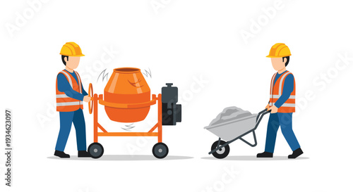 Asphalt paving and repair services set, vector illustration. Male characters workers driving yellow asphalt compactor roller, working with jackhammer wheelbarrow shovel. Asphalt pavement installation.
