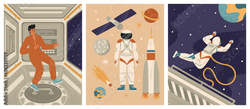 Astronaut in open space and in rocket cabin card, banner, flyer or cover template isolated set. Cosmonaut galaxy explorer characters vector illustration