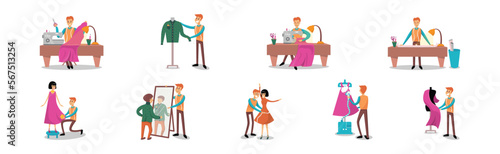 Atelier scene set, flat vector illustration. Dressmakers, fashion designers sewing clothes, making patterns. Customers choosing fabric, trying on dress. Sewing workshop, studio. Tailoring business.