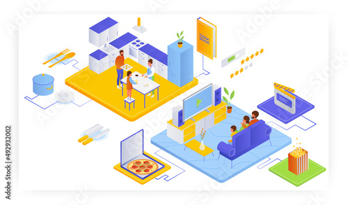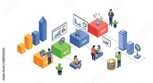 Auction and bidding isometric flowchart, vector infographic. Auctioneer with gavel announcing prices and people with bid paddles buying car, house, antique art. Online auction and mobile bidding.