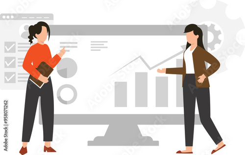 Female characters auctioneer selling vintage vase from computer and buyer making bids, flat vector illustration. Online auction. Internet bidding.