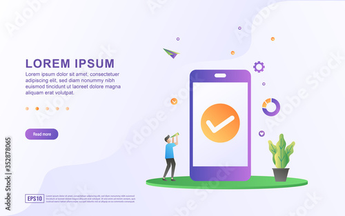 Audio media library landing page website template. Vector illustration of smartphone with audio musical icons, people listening to music from mobile device and computer while working or doing sport.