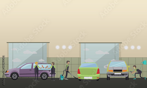 Car service, auto repair concept vector illustration. Workers repairing and changing auto spare parts design elements in flat style.