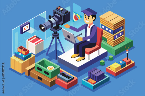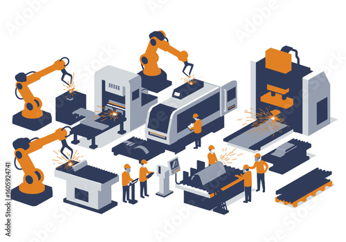 Cargo robots, flat vector isometric illustration. Automated line, cute robots packing cardboard boxes. Industrial automation and robotics concept.