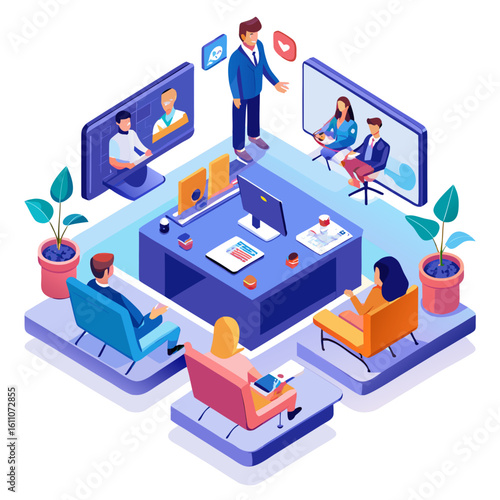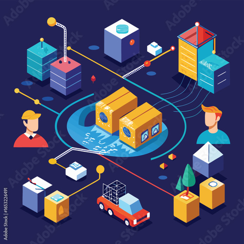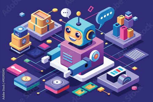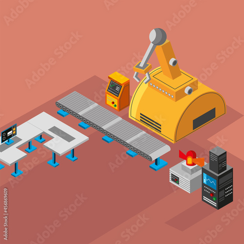Cargo robots, flat vector isometric illustration. Automated line, cute robots packing cardboard boxes. Industrial automation and robotics concept.