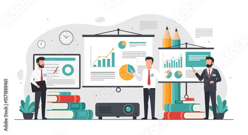 Automated production line, flat vector illustration. Robot machines working at industrial automatic conveyor belt with cardboard boxes. Robotic assembly and packaging process. Industry automation.
