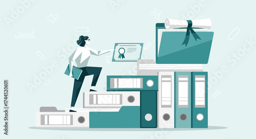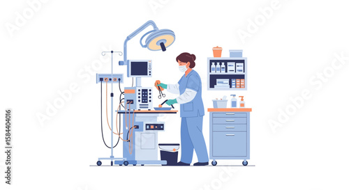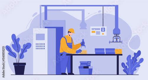 Automated production line, flat vector illustration. Robot machines working at industrial automatic conveyor belt with cardboard boxes. Robotic assembly and packaging process. Industry automation.