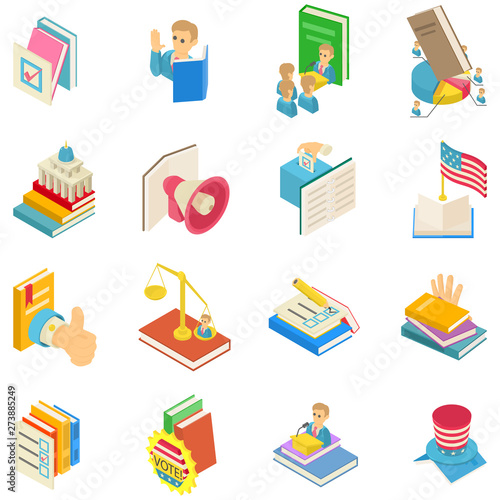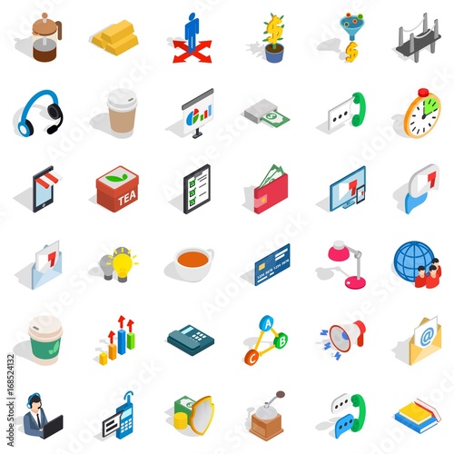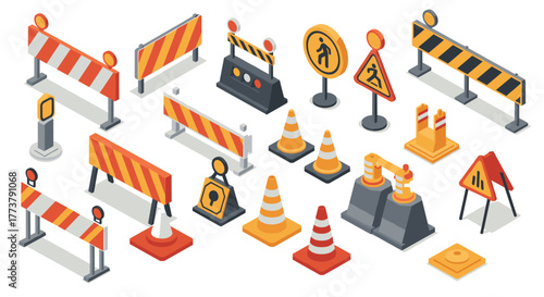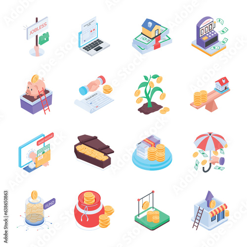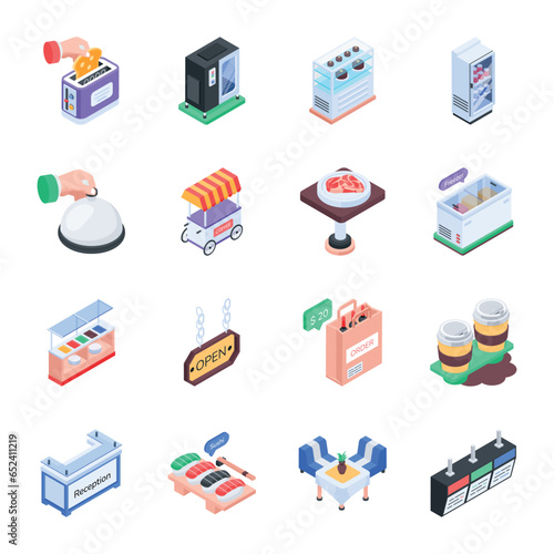 Vector automated production line flat isometric icon set. Manufacturing equipment with conveyor system, industrial robotic arm for assembly and packaging.