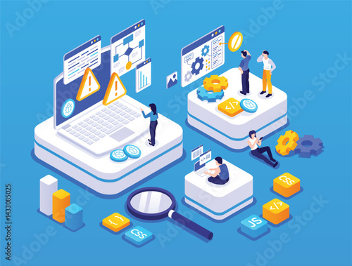 Automated testing software, flat vector isometric illustration. Software tester, debugging, quality assurance, automation.