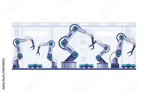 Automatic production conveyor belt with industrial robotic arms, line operator silhouettes. Vector illustration in paper art style. Factory automation, robotic industry, automation in manufacturing.