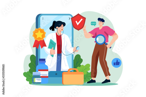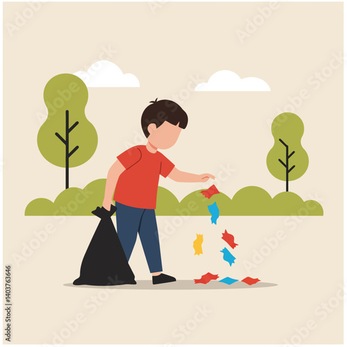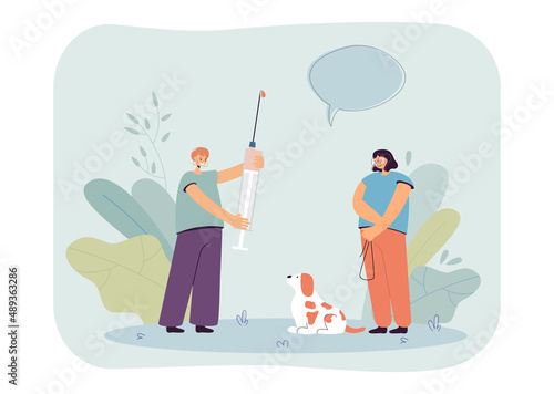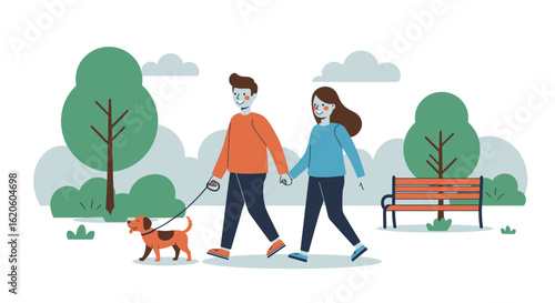 Autumn season. Happy woman walking with her pet dog in city park and enjoying fall, flat vector illustration. Outdoor activity, healthy lifestyle.
